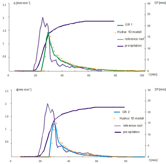 For the event of the 13.06 used to calibrate the model, the mean square error (RMSE), (6) was 0.16 mm·min−1 (GR1, leca) and 0.12 (GR2, perlite), while the calculated statistics describing the relative value of residual variance, the Nash–Sutcliffe efficiency (NSE) (7)), and the assumed values at the level 0.74 (GR1) and 0.84 (GR2). A simulation can be accepted as satisfactory when NSE >0.5 (a higher model accuracy for NSE values close to 1). The calculated NSE and RMSE values for validation are presented in the Table 4. During validation, the models designed as leca- and perlite-based displayed a good representation of flow volume intensity, accurately simulating events observed in other periods. It can, therefore, be concluded that in both cases the level of matching achieved was close to good.