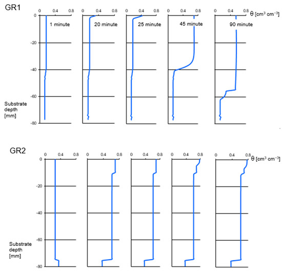 The water content and time and depth illustrate the conditions of infiltration in the green roof systems (Figure 3). In the conditions of high saturation of the designed profiles, one can note that in the model based on expanded clay extrudate (GR1) the state of moisture close to porosity was attained in minute 45. In the case of surface GR2 a significant level of saturation was observed already in minute 20. In this case, this may indicate an improvement of the retention capacity of the profile and of the hydrological properties of the systems as a result of the application of the admixture of perlite in the substrate.