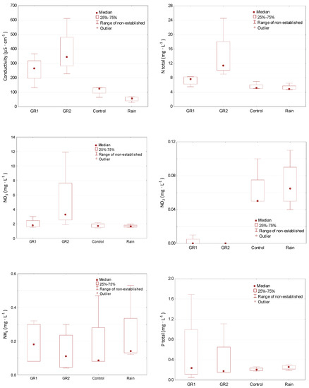 For each of events, samples were collected from the model green roofs, from the control surface, and from atmospheric precipitation. The Analyzed indicators were total nitrogen (TN), NO2, NO3, NH4,T-P, PO4, Cu, Zn, Pb, Cd and electrolytic conductivity. Contrary to the adopted hypothesis, there was no distinct improvement of water quality in the runoff from the experimental surfaces. An increase in the level of concentration of nutrients was noted in runoff from the same surfaces. Table 5 presents the results of the water quality and mean values of the determined indicators. The load of total nitrogen in the runoff from the green roofs exceeded the concentration in rainwater and amounted to 7.17 and 13.01 mg∙L−1. Distinctly higher levels of concentration of total nitrogen for the substrate with perlite could have been a result of the composition of the substrate. It should be emphasized that a variation of the loads of that indicator was observed among all of the analyzed rainfall events, in particular for surface GR2, as seen Figure 4. In order to illustrate the observed variability of the pollutant load in relation to rainfall and control surface, frame charts were prepared. The lower and upper boundary of each box indicate respectively the 25th and 75th percentiles. Whiskers above and below each box indicate the 90th and 10th percentiles. For the NO3 and NO2 indicators, no significant differences were observed compared to rainwater. The recorded values of NO2 were at trace.