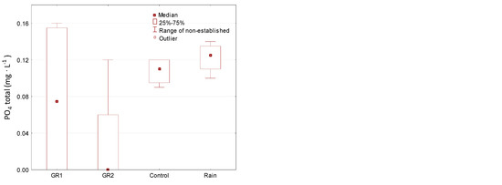 The concentrations of PO4 in the runoff from the analyzed surfaces, and in rainwater, were relatively uniform, but in the case of runoff from surface GR2 the concentrations were the lowest. Phosphorus compounds in the alkaline soil environment can be bound by calcium and manganese. This may indicate considerable concentrations discharged in the course of the vegetation season and during the winter period. The maximum concentrations of biogens can be observed after at least a dozen days from fertilization [43].