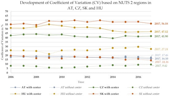Coefficient of variation showing the development in % of AT (Austria), CZ (Czech Republic), SK (Slovakia) and HU (Hungary) NUTS 2 regions between 2006–2017, based on regional GDP (PPS per inhabitant in % of the EU 28 average; EU 28 = 100) (Source [97], own illustration).