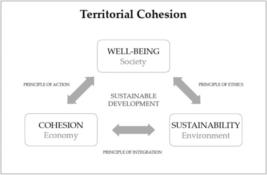 The project’s final report identified sustainable development as being based on the principle of action (for change), the principle of ethics (set of values for economic, social and territorial equity) and the principle of integration (conceptual integration for a multidimensional approach) [103]. Furthermore, with sustainability being a component of well-being and cohesion, cohesion represents a horizontal component across the different dimensions of well-being (economic, social, environmental).