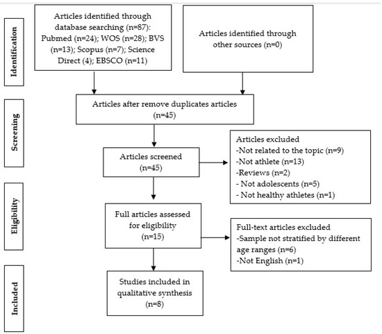 The initial literature search in databases revealed a total of 87 articles, of which 42 were duplicate. After reading the title and the abstract, nine articles were excluded because they were not related to the topic and 13 because they were not performed in athletes. Fifteen studies were selected for full-text reading, of which six were excluded because they did not stratify the sample by different age ranges and another one because it was not written in English. Thus, eight studies met the inclusion criteria for the systematic review and were included in the qualitative analysis, as shown in Figure 1.