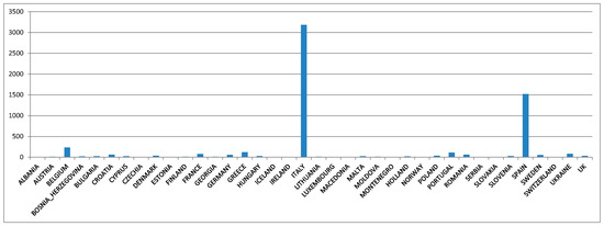 Since the 2000s, the European Union has sought to improve the level of risk management in the member states. However, the EU strategy is mainly focused on natural risk [42]. For example, in 2007, the European Commission defined the Floods Directive 2007/60/EC [43]. This Directive states that “Flood risk management plans should focus on prevention, protection and preparedness. … The elements of flood risk management plans should be periodically reviewed and if necessary updated, taking into account the likely impacts of climate change on the occurrence of floods”. The Directive therefore refers to climate change but not to the concept of resilience. In 2013, a specific EU Strategy on Adaptation to Climate Change was designed (Action 7: Making infrastructure more resilient, for creating a climate-resilient region and implementing local climate adaptation plans). “The overall aim of the EU Adaptation Strategy is to contribute to a more climate-resilient Europe. This means enhancing the preparedness and capacity to respond to the impacts of climate change at local, regional, national and EU levels, developing a coherent approach and improving coordination” [44]. In recent years many European cities have implemented adaptation or mitigation plans; in some cases, they have both. Indeed, European cities have responded positively to the Covenant of Mayors initiative and have taken steps to draw up and draft their own Action Plans to achieve the 2020 and 2030 goals. Many of these plans are available on the “Covenant of Mayors for Climate & Energy platform” opened by the European Union in 2011, with the aim of collecting the initiatives promoted by European cities to address the phenomenon of climate change. In Figure 1 and Figure 2 the Action Plans realized in the in the European cities are reported. The majority of these Action Plans were drawn up in two EU countries: Italy (3184) and Spain (1520) [45].