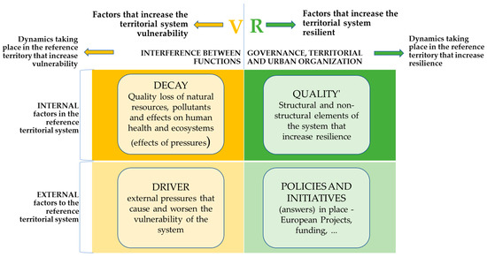 Each scenario is associated with specific interventions, included in the plan, that should be updated in order to verify if the action has led to an effective improvement of the resilience level. In the literature there are several examples to evaluate urban resilience [76,77]. After considering the main methods in the literature and the research objectives, this study identified the following macro-sectors for the assessment of urban resilience: ecological environment [78,79], safety, mobility and transport, education, health, public spaces, socio-economic context, and actors involved. Each actor of the quadruple helix is responsible for the implementation of the actions foreseen in the plan. Research, enterprises, public authorities, and citizens work together to increase urban resilience. To assess the level of resilience, a quali-quantitative analysis is developed. This analysis is based on a study done by the Lombardy Region (Strategic Environmental Assessment of the Regional Operational Programme of the European Regional Development Fund -ERDF ROP- 2014–2020) [80]. For each of the chosen territorial areas, the elements of vulnerability and resilience that characterize these zones (degradation and quality) and the external factors that can influence these elements (pressures and responses, or policies, unplanned changes and trends) are analyzed (Figure 5). The concepts of vulnerability and resilience are treated as elements to build the ongoing territorial dynamics over time and the response capacities of the various territorial areas and actors. This study was developed through a “vulnerability and resilience analysis”; an atypical SWOT (Strengths, Weaknesses, Opportunities, Threats) analysis. The SWOT is aimed at focusing on the strengths and weaknesses of the reference context, as well as the related opportunities and threats linked to the hypothesis of development underway [81]. This analysis summarizes the general knowledge framework on the resources, vocations and critical issues that characterize a territory, in order to identify the areas and activities necessary to improve risk resilience.