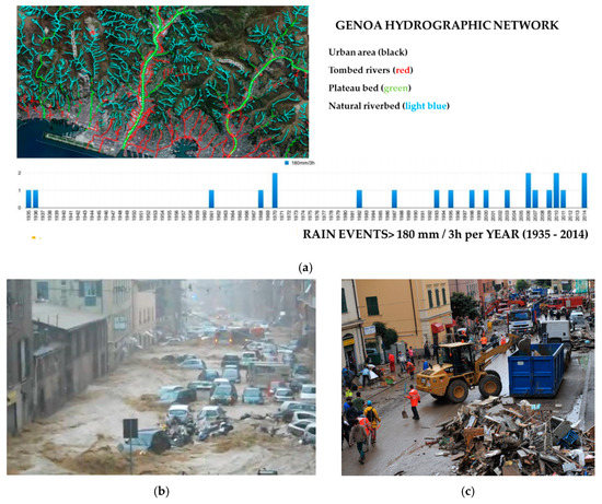 (a) Genoa hydrographic network (source: Urban Agenda for UE, 2019), (b) via Fereggiano during the flood of November 2011 (source: Genova.24.it); (c) Via Fereggiano post-emergency (source: Ansa.it).