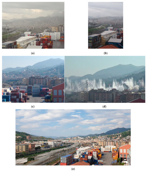 Image after the collapse of the Morandi bridge (August 2018–April 2020). (a) Collapse of the Morandi Bridge—14 August 2018. The post-emergence in Val Polcevera: demolition of the bridge (c) 20 June 2019; (d) 28 June 2019. (e) Reconstruction new bridge—22 April 2020.