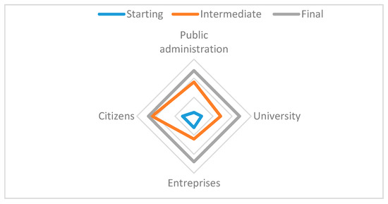 Considering a specific macro-sector, for each action envisaged it is necessary to evaluate the impacts of each quadruple helix actor. These impacts can be positive (score 1), negative (score −1) or neutral (score 0), depending on whether the actors involved have carried out effective or ineffective actions or have decided not to act [82]. Therefore, an urban system can react in a positive manner to a disaster if there is a synergy among these four actors. Then, there are multiscale relationships between the resilience indicators that concern the various territorial scales investigated and the four actors considered [83]. The efficiency of the intervention can be monitored by recalculating the value of the resilience index and comparing it with the initial situation [84]. The results obtained through simulations can constitute a sort of “diagnostic evaluation” aimed at directing ordinary and strategic planning and territorial management choices [85].