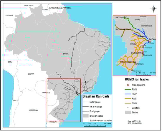 By 2015, Cosan SA conglomerate, an important sugar cane and ethanol player in Brazil, proposed to take control of ALL. The vertical merger, Administrative Council for Economic Defense (CADE) inquiry 08700.005719/2014−65, was approved in February of that year, and the companies started the unification, becoming the most significant holder of a rail concession in Brazil [5]. In this context, the four tracks of RUMO-ALL were named: (i) Rumo-North (RMN); (ii) Rumo-West (RMW); (iii) Rumo-South (RMS); and (iv) Rumo-Paulista (RMP).