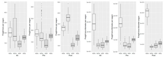 In February 2015, Cosan SA merged with ALL rail concession in Brazil, resulting in four track sections: RMN, RMP, RMS, and RMW. We suppose that after the merger, the operational efficiency changed. Graphically, we can now see this for RMP and RMW, but for the other operators, this phenomenon is not evident. As described above, some changes have begun in 2008, 2012, and 2015, suggested by this descriptive analysis as shown in Figure 8.