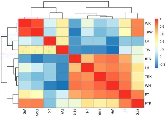 Considering the relationships among the analyzed variables, as detailed in the methodological approach section, the correlation matrix, presented in Figure 3, was computed. The heat map (Figure 3) indicates the correlations between the variables and serves as a preliminary choice of variables that can be used to explain efficiency and avoid overlapping information. This is a frequent procedure in the DEA modeling process. The dendrogram associated with the correlation matrix shows a strong relationship between FT and FTK, which was expected, as FTK was obtained from FT.