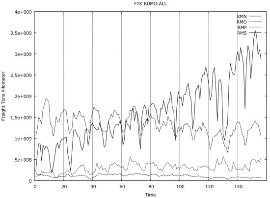 The complete time-series of rail transport production, in freight tons kilometer (FTK), is presented in Figure 4. The transport production had a slight reduction trend along the period under analysis (2006–2018) for Rumo, as given before, except for the RMN track. The other segments of Rumo presented practically constant production levels, excluding the intra-annual seasonality. Still, the intra-annual seasonal structure was less significant in the RMW section. Both RMS and RMN sections presented lower production levels at the beginning of the year and an increase during the first semester due to the soybean harvest and export shipping. The only track that did not experience seasonality was RMW, due to the nature of the products transported.