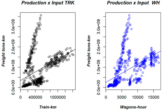 Dispersion analysis among production and input variables. Source: Prepared by the authors based on ANTT Data [56].