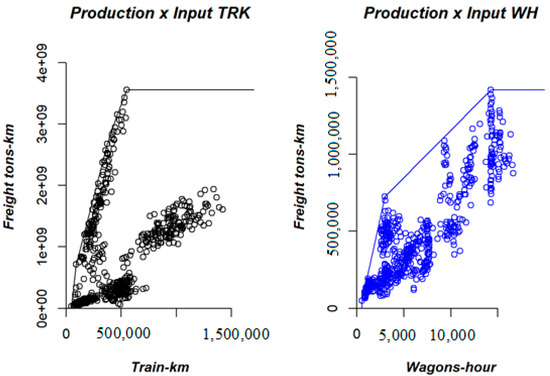 The economic literature indicates that capital and labor variables are important to compose the production function. Nevertheless, we did not observe all variables to describe the production process separately, as described in Section 2.1. The modeling was carried out by an ad hoc selection of variables, understanding the superposition of information in each observed component of the rail system. With the information presented in Table 1 and Figure 3, we analyzed the input variables, one by one, with some possible combinations of variables to compose the model, despite the eventual strong statistical correlation presented in Figure 3. The number of trains per period has a direct relationship with rail production. Similarly, the consumption of fuel has a direct relationship with the freight tons kilometers, although there may be differences among concessionaires because the locomotives may be more or less modern and due to operational models. A different relationship can be observed among the usage of locomotives, which has a direct relationship with production and is likely to be also directly related to the number of trains and the consumption of fuel. This is a result of the locomotives being vital assets as part of every train and spending fuel in their operations; the usage of wagons presents a direct and positive correlation with the freight tons kilometer variable, since the increase in the usage of wagons is conditioned to the demand for freight that needs to be accommodated in these vehicles. The DEA model specified, therefore, considers constant returns of scale based on statistical tests, and input orientation was used, given the operating aspects of the Brazilian railroads analyzed and the minimization of input observed in 13 years of the concession. The variables chosen were two in order to propose a more parsimonious but robust model: production variable (TRK), and demand variable (WH).