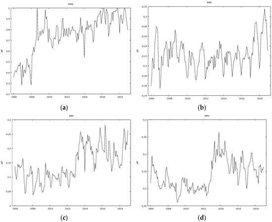 (a) RMO, (b) RMN, (c) RMP, (d) RMS efficiency time-series from 2006 to 2018.