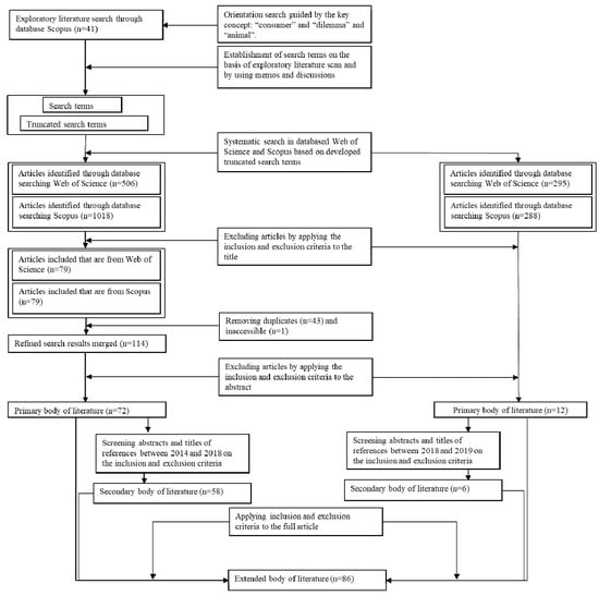 Two major general scientific databases were used to identify the relevant research: Web of Science and Scopus. We first conducted an exploratory search in Scopus by focussing on two key concepts: “consumer dilemma” and “animal”. The purpose of the exploratory literature search was to identify the most relevant keywords used to describe each of the concepts. Following this initial search, the final query was created (Table 1). This query retrieved papers addressing all relevant concepts, where each concept was operationalized by search terms consisting of a combination of keywords (e.g., moral). In addition to the concepts, the search was limited to the English language and research articles. The year of publication was not limited.