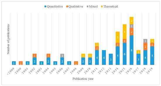 Among the remaining 86 studies, about two thirds were quantitative studies (n = 57). Fourteen studies were theoretical studies. Of the remaining 15 articles, 12 were qualitative studies (interviews/focus group methods) and three applied mixed methods, with both qualitative and quantitative methods. A graphical depiction of the number and the publication year of theoretical, empirical (qualitative, quantitative, mixed-method) publications that focus on consumer moral conflicts is presented in Figure 2. The earliest publication was a study conducted by Rozin and colleagues about consumer moral conflicts in meat-eating [25]. The study focussed on emotions (i.e., disgust) associated with (im)moral eating. Following that initial paper, about 1–2 publications per year studied the morality of meat-eating. A steep increase of 33 studies mentioning the topic of meat paradox was observed between 2014 and 2016, which was shortly after the “meat-eating justification” scale was developed [26]. At the same time, there were ongoing philosophical debates about the moral standing of animals [27].