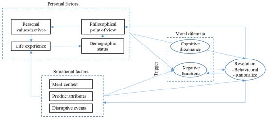 Based on the systematic review, we conclude that the experience of moral dilemma consists of two elements: (1) negative emotions evoked by the thought of, or the confrontation with, eating meat; and (2) cognitive dissonance between eating meat and the belief that current meat production is immoral. Negative emotions can be seen as an experience of the moral dilemma, in line with theories on the psychology of morality [102,103]. The moral dilemma causes mostly negative emotions, such as guilt, disgust, empathy, etc. [102]. This is in line with Frijda’s arguments that emotions are elicited by events that are personally relevant and that negative emotions function as an indication that the situation is problematic [104]. The occurrence of negative emotions and cognitive dissonance is subject to two groups of determinants: (1) personal factors of individual consumers, such as values, motivations, life experience, demographics, and a philosophical point of view on animal eating; and (2) situational factors individuals are confronted with, such as eating meat in the situation of consuming a meal, reminded of, such as meat product attributes being associated with sentient beings, or confronted with, such as disruptive events like the media coverage of animal welfare issues.