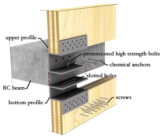 As illustrated in Figure 4, the damper consists of two steel profiles, which connect the CLT panels of two consecutive floors with the existing interposed RC beam. The upper profile is connected to the RC beam by anchor bolts. The bottom profile is provided with slotted holes and is connected to the upper one by pretensioned high-strength bolts. The shear force is transmitted from the upper to the bottom profile by means of the friction exerted in the contact surface. The number of bolts and the pretension force control the friction force. During an earthquake, when the force transmitted by the damper attains the value of the friction force, the upper profile slides on the bottom one dissipating seismic energy. The system is designed to allow a quick and easy external installation, to prevent damages for low- or medium-intensity earthquakes, and to be well adaptable to the most common RC framed buildings. For instance, in buildings with external RC flat beams and balconies, the upper profile could be fixed directly to the above overhang. The CLT panels are pre-assembled off-site with the upper profiles, while the bottom profiles are fixed on-site during installation in order to properly align and connect the friction surfaces of the two profiles. The damper inspection and maintenance are also eased by the string courses, which can be easily removed (Figure 3b). These string courses are designed to be connected only to the upper panels, thus allowing them to slide in case of an earthquake. The installation of both prefabricated panels requires the use of lifting equipment, thus avoiding the costs and time needed for the scaffolding set-up. The quick and easy installation also reduces the risk of errors and unexpected on-site delays as well as allows easy removal and replacement of all components.