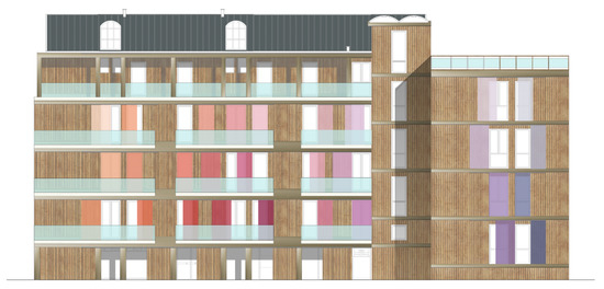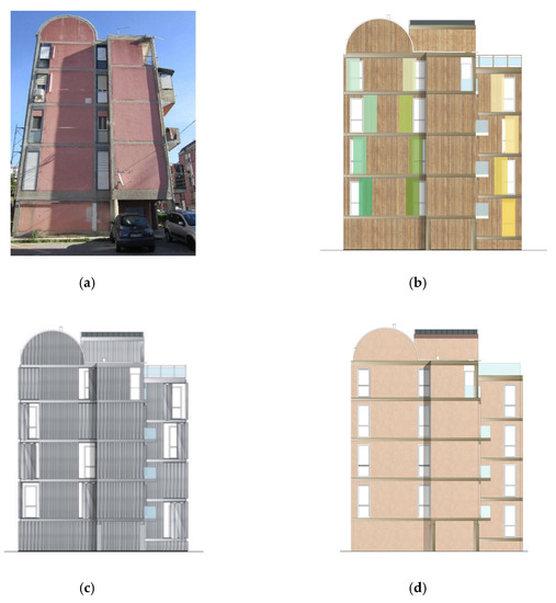 Regarding the improvement of the architectural image of the case study, Figure 8 and Figure 9 report three possible design solutions in order to show the aesthetic potential and versatility of the proposed retrofitting system. In particular, the pictures display the use of prefabricated timber panels cladded with wooden boards (Figure 8 and Figure 9b), metallic sheets (Figure 9c), and plastered cement boards (Figure 9d). The metallic cladding entails higher costs but reduced maintenance, while the wooden and plaster ones are less expensive but need more frequent maintenance; moreover, wooden claddings generally are more resistant in case of accidental collision during the installation of the panels on-site. External sun-shading devices to control solar radiation were also included to verify their effective architectural integration. The proposed shading devices, which are variably colored in Figure 8, slide horizontally on metallic trails fixed at the string-course level.