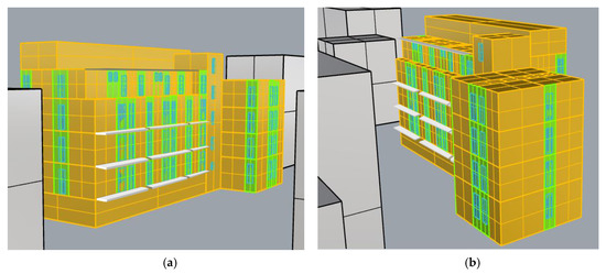 (a,b) 3D model of the selected building in Grasshopper on Rhino (post-renovation).
