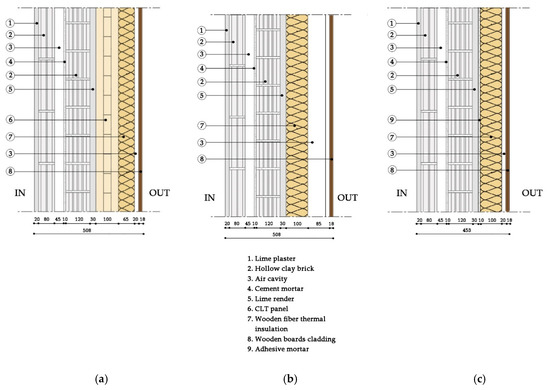 Stratigraphy (mm) of the outer wall post-renovation with the addition of (a,b) prefabricated timber panels (PTP): (a) structural CLT panel, (b) non-structural wooden-framed panel; and (c) external thermal insulation composite system (ETICS).