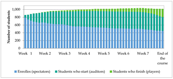 The proportion of each type of student fluctuates because (1) the registration system is open during the course and (2) students’ behavior is changing weekly. The figure shows how while the number of students registered (the sum of the three categories) increased, the number and proportion of spectators decreased as the weeks passed because students achieve the goals of each module and moved from the spectators category to the auditors and players categories. In addition, the lack of registration deadlines stimulates news enrolments during the passage of the course. After an increase in the absolute number of enrolled of 9.3% in the first week, the increase stabilized going from 4% in the second week to 2.6% in the third and between 1.5% and 1% for the rest. In the last week, however, there was a decrease of 2.2% for the enrolled students, who decided to leave the course. Regarding the students who started the course, the greatest increases occurred in the first three weeks and were subsequently reduced to increments of 9.7% in the fourth week and between 6% and 4.8% in the following weeks. It is worth noting that, in relation to the number of students who finished the course, a rebound occurred during the last week, in which half of the total students completed the course.