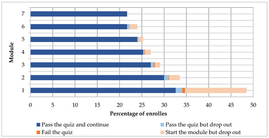 In total, 21.4% of enrollees dropped out of the course after having started a module, with two-thirds of those dropping out during the first module. It is also necessary to take into account the dropouts that occurred from students after passing a module quiz, which in total represent another 4.4% of those enrolled, with more than half occurring before the third module.