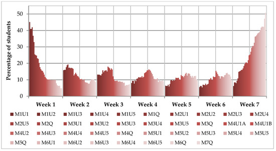 This indicates that most of the students do not meet the recommendation to follow a weekly calendar to pass each module. In this sense, it is worth noting that only one of the 215 students who passed the course completed each module in its corresponding week. This low-rate pattern confirms that students generally self-managed their involvement in the course. However, the number of students who followed a weekly calendar was a little higher in the rest of the modules, especially in the first module (116 students, 32.9%). Likewise, it was observed that during the first modules (modules 1–3), there was a greater activity during midweek, while this activity was gradually transferred to the weekend as the course progressed, especially in the last three modules. For the two first modules, the days with the highest involvement were Monday and Wednesday, whereas for the rest of the course was Sunday, both in the visualization of the videos of the units of each module and in the quiz performance (Figure 4).
