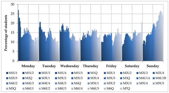 Percentage of students who perform the module quiz and view the video of each unit according to the day of the week. Note: ‘M’ refers to ‘module’ and ‘U’ refers to ‘unit’, so ‘M1U1′ refers to unit 1 of module 1 and successively. Likewise, ‘Q’ refers to ‘quiz’.