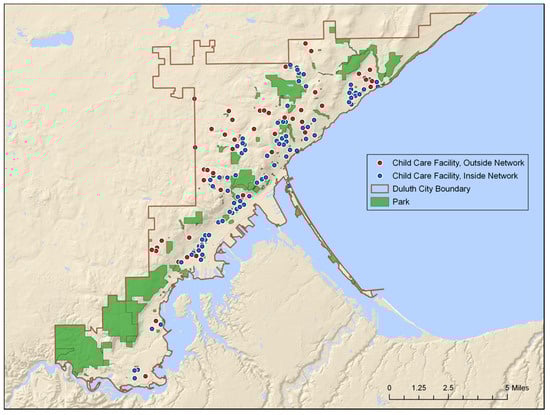 The 144 childcare facilities in Duluth, Minnesota: 93 childcare facilities located within the 400 m network, 51 located outside of the 400 m network.