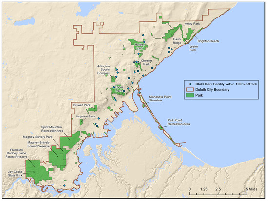 Moreover, one additional and critical reason to highlight Duluth as an interesting case study for preschool access to nature play is the growing nature play movement in the community over the past decade. In 2008, students at the University of Minnesota Duluth Environmental Education graduate program held a nature play symposium for the community, inclusive of a community survey. The implications from that survey outreach to parents and daycare providers included increasing access to natural spaces and an identified need to raise awareness of play’s value in natural settings [62]. The Duluth Nature Play Collaborative (DNPC) is another community asset for nature play. The DNPC is a loosely organized group of parents and early childhood professionals formed in 2013 to support the creation of several nature preschools in the area [63]. While there is no official membership, the DNPC has a mailing list of 60 people with monthly meetings and yearly gatherings. The collaborative describes itself as “a group of nature preschool teachers and other community members that seek to educate, inspire, connect, and advocate for nature play for young children in the Duluth area” [64]. One specific example of the DNPC efforts is community film screenings featuring nature play films, research, and discussion. At the autumn 2017 gathering, the question of who is being served by nature play opportunity in Duluth was considered. The discussion considered how issues of access can be explored from multiple perspectives, from physical geography to social equity. From this community discussion, the idea of mapping preschool access to city parkland emerged.