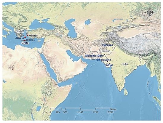 Another ancient civilization that flourished around the same time period is the Indus Valley civilization. Historians and archaeologists have not completely deciphered the writing system—the data come mainly from archaeological excavations. It is believed that the Indus Valley civilization, at its pinnacle, affected an area much larger than Mesopotamian (e.g., Sumerian and Assyrian) and Minoan civilizations, with more than 1500 cities at its peak [7,8]. Geographically, it covered an area of about one million square kilometers. The most notable sites are Moen-Jo-Daro, Harappa, Kot Diji, Dholavira, Rakhigarhi, Kalibangan, and Lothal (Figure 1) [9].