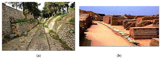 Minoan and Indus valley cities were well connected by a network of roads, which were well drained, and had water and sewage distribution systems. Paved street networks that connected the palaces and cities in Minoan Crete were constructed in the mid-Minoan period (ca 1750–1450). Well preserved paved streets, usually narrow, appear in the Minoan ruins of Gournia and Palaikastro and other Minoan sites [17]. A good example is the ancient street in Knossos known as Royal Road, which is considered as the oldest street in Europe (Figure 2a). Royal Road connects the [18] theater area in the main palace with the small palace and is very well paved, with stone made slabs and drains on both sides. Several grandstands may have been constructed in the mid-Minoan times and possibly rebuilt at the very end of the late Minoan times [19].