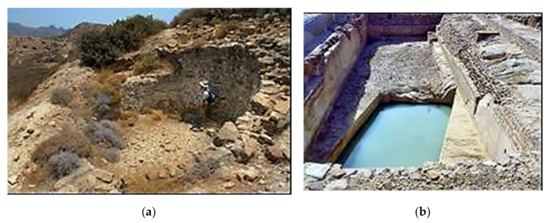 Water cisterns usage was a very well-known practice by the Minoans. Technical characteristics and records of Minoan cisterns are reported by Angelakis (2016) [27]. Essentially, the system had been extensively employed by almost all later civilizations in Ancient Crete. Cisterns were used to store both rainwater and spring water, which was conveyed to the urban areas by aqueducts [6,28]. The reservoirs were typically circular structures, assembled with rocks beneath the earth exterior, having diameters of 1.5 m to 7.0 m and depths of 2.5 m to 5.0 m. An earlier Minoan water storage system was found at the focal point of a dwelling compound with origins during the third to second millennium BC in Chamaizi [29]. Similar expertise was employed in the construction of Zakros and Phaestos fortresses (Figure 3a). The reservoirs were joined by means of diminutive channels, which were designed to amass run-off from the highlands and plain areas [30].