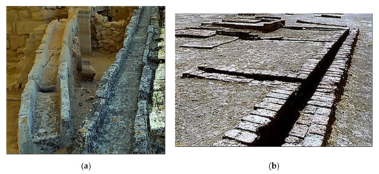 The Minoan civilization had the capability to establish drainage and sewerage systems in several palaces, which are functioning properly to date. As the hill in the palace of Knossos occasionally received large amounts of precipitation, the development of a drainage system was necessary. An open channel sewerage and drainage system of a total length of 150 m was constructed using boulder slabs approximately 79 cm × 38 cm per channel, lined up by means of clay or mud (Figure 4a). The sewers and drains were large enough to allow humans to enter for maintenance and cleaning. For locations where the channels were completely closed for long distances, manholes were constructed for maintenance. The air-shafts at equal distances were provided for the purpose of aerating the sewer systems [24]. Similar drainage and sewerage systems were found in several other Minoan sites, of which the most significant is the excavation in the Hagia Triadha, located on the southern coast of Crete (Figure 4a) [30].
