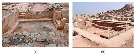 In the past few decades, archaeological explorations carried out at Harappa, Moen-Jo-Daro, and Lothal revealed a number of incredible observations. Town planning in Moen-Jo-Daro, Harappan, and Lothal, in addition to palaces, had numerous homes, from double-roomed to multi-roomed tall buildings [17]. The town of Moen-Jo-Daro had a more reliable drainage, water supply, and sewerage system which was constructed with mud bricks, which were highly functional and more reliable compared to modern times. The granaries were also wisely assembled, with planned platforms and air ducts (Figure 4b).