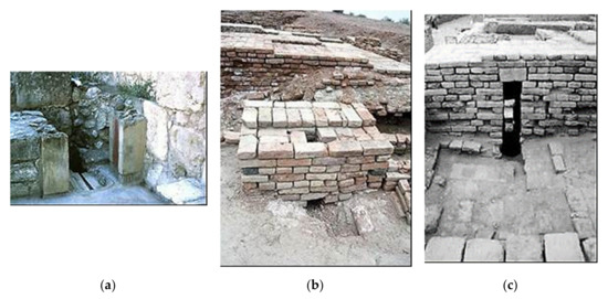 In the Indus Valley civilization, the drainage systems of the residences were connected with sewers linked into the main public conduits. The sophisticated drainage pattern and construction of the Harappa residences indicates that they developed a high sense of healthiness and hygiene (Figure 4b). The drainage system and drains were covered with bricks or stones, with inspection traps and manholes at regular intervals. Every house had their own soak pit, which collected all the residual solids and allowed only the water to surge into the main sewer drains [49]. Finally, the sustainability principles of those applied technologies is remarkable.