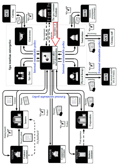 The relations shown in Figure 2 are based on the business objectives of particular entities, but it is also worth indicating their links with the objectives of sustainable tourism. In modern times, it becomes necessary to develop sustainable policy in the scope of implementation of sustainable development rules. In the case of health resorts, these rules should be defined separately for internal relations of business model elements and separately for external relations focusing on local cooperation. The internal sustainable policy should take into account as criteria proposed by the Global Sustainable Tourism Council (GSTC) [5] in the scope of proecological behaviors, in particular, concerning economic use of natural resources (both used for health resort treatment and for other purposes) and reduction of pollution (gas emission, transport, water, and electric energy), as well as combating the results of overtourism, overpopulation, and excess infrastructure. The internal sustainable policy should also cover the education of behaviors that protect the natural environment and local culture, directed towards the recipients of health resort services. It is one of the missions of socioeconomic entities, carried out to increase the responsibility for the health resort and cultural resources of the commune being visited, and for the place where the patient functions every day.