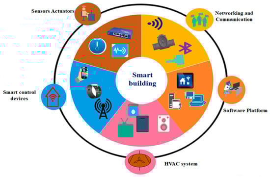 A clear illustration of smart building components is given in Figure 1. Sensors monitor and send the building information (data) to a computer processor for further data processing and storage processes. Usually, sensors communicate through the access points situated inside the building and then communicate across a gateway. The gateway acts as an aggregate point that collects the sensor data and sends it to the storage medium, such as cloud systems. The network defines the collection of sensors through which the data are collected and organized at a central location. Software platforms act as a host through which the services are offered to the smart building users. HVAC is heating, ventilation, and air conditioning systems. HVAC is a sensing device mainly used to reduce energy consumption across smart devices. It compares the actual state with the target state and derives the conclusion. Smart devices control appliances and outlets. It enables the owners and occupants to control their devices remotely. Some of the considerable examples of smart devices include home alarms and sensor. Smart buildings devise corrective action and automation as a response to alarms created by a system. However, the homeowner uses a mobile phone to set his alarm and control their appliances by enabling and disabling or performing other tasks [8].