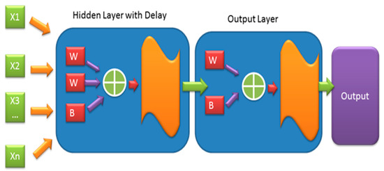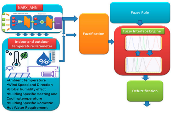 The HVAC-DHW System is a supervisory control unit that gets the weather input from various sensors, this input information is then fed into non-linear autoregressive artificial neural network with external input (NARX-ANN), as shown in Figure 3, that processes these data and produces the internal building temperature as output. This forecasting internal temperature is then fed into a fuzzy logic controlling system that controls the temperature based on user comfort. Based on different weather conditions, the proposed NAR-ANN divides input parameter in two categories: Summer and winter for simulating the temperature. For summer NARX-ANN models are constructed with 10 hidden layer neurons with network weight and bias, while for winter, the model is constructed with 30 hidden layer neurons. In addition, we use five input values, including external ambient temperature ( in °C), global humidity effect (GH(, wind speed and direction , internal building temperature ( in °C), and DHW temperature (( in °C). The input value of the considered parameters (, GH, , ) is sensed at time and gives NARX-ANN model computes desired internal building temperature at time + 1. Afterward, the difference between the internal temperature at and + 1 represented by is applied as an input to a fuzzy controller. The equation for NARX-ANN [28] based on the given parameter is defined as given in Equation (1):