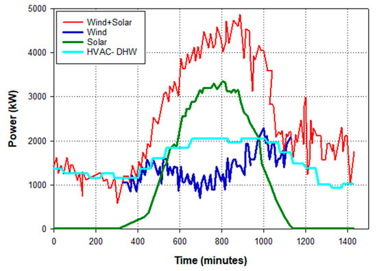 We consider a RES-PP consisting of four equal size turbines of wind, one Photovoltaic Solar panel and 2500 HVAC-DHW systems. The break-in, break-out, and rated wind speeds of all wind turbines are 4 m/s, 30 m/s, and 12 m/s, respectively. The power rate of all turbine wind is 1.5 MW and of all solar power entities is 4.5 MW. For different cases, including speed of wind, irradiance of solar power, temperature ambience of wind and solar power and using Equations (7) and (9), forecasting of power generation of solar and wind entity per 10 min is represented. On the basis system forecasting uncertainties and power utilization of all individual components of HVAC-DHW system, the total energy consumption of the proposed system to maintain all buildings at preferred temperature and preferred DHW demand is shown and energy consumption of individual auxiliary devices of HVAC-DHW system as mentioned in Figure 7.