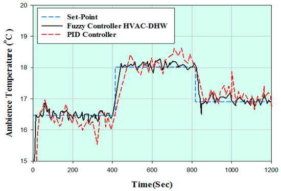 The performance of the proposed fuzzy controller-based HVAC-DHW system is evaluated by comparing it with PID controller-based HVAC system. Figure 8 shows that the proposed fuzzy controller has a stronger and more extraordinary control response ability than PID controller.