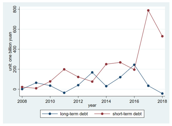 From the China Stock Market and Accounting Research (CSMAR) database, we collected the total new long-term debt and total new short-term debt of all Chinese A- share listed companies from 2009 to 2018, as shown in Figure 1. This shows that the annual total of new long-term debt is generally lower than the annual total of new short-term debt (with the exception of 2009, 2013 and 2016). It also shows that the supply of long-term funds in the Chinese market is restrained.