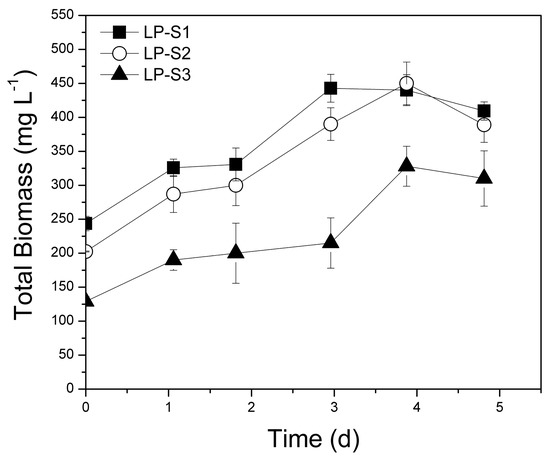 Figure 2 presents the evolution of total biomass recorded. Biomass productivity ranged from 111.0 to 198.9 mg L−1 d−1 (Table 2) with maximum biomass productivity recorded in the LP-S2 set, which had a high N:P ratio (Table 1). It is known that biomass production is highly dependent on C:N:P ratios. Some reports indicate that a combination of high N and low P leads to enhanced biomass production and nutrient removal while the optimum N:P ratio recorded within the range of 8.2:1–45:1 [48,49]. However, it is generally accepted that the favorable N:P ratio is strain specific [50].
