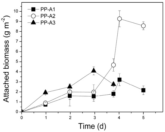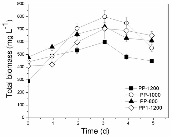 Pilot-scale experiments with PLE were conducted in both suspended and attached growth systems. A transparent Plexiglas column reactor was used (Figure 1, Section 2.3.2) applying the same conditions of light intensity, constant illumination, and temperature as those tested in the laboratory-scale experiments. The configuration of the column allowed media recirculation so that the nutrients and microbes were evenly distributed throughout the reactor. The reactor was initially examined in suspended growth mode with a recirculation rate of 1600 mL min−1 using chemical media (CS) and inoculum from the stock culture. Microscopy observations revealed that the filamentous cyanobacterium Leptolyngbya sp. could not maintain its morphology at this high recirculation rate and the filaments appeared broken. Therefore, different recirculation rates were tested in the experiments using PLE that presented similar initial d-COD concentrations (about 1000 mg L−1) and N:P ratios (about 3:1) (Table 3). Specifically, the pilot-scale experiments were performed using recirculation rates of 800 mL min−1 (PP-800), 1000 mL min−1 (PP-1000), and 1200 mL min−1 (PP-1200) (Table 3). The evolution of total microbial biomass resulting from these experiments is presented in Figure 6. Biofilm attachment through time was observed both on the walls of the bioreactor and in the circulation column.
