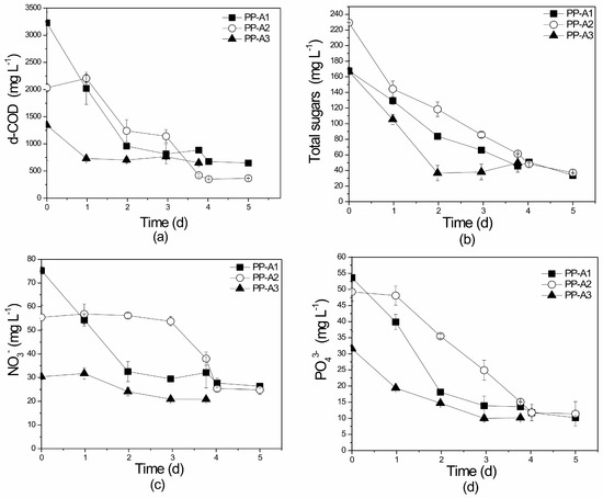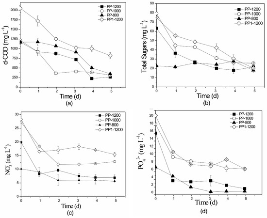 Profile of: (a) d-COD, (b) total sugars, (c) NO3−-N, and (d) PO43− removal over time in the pilot-scale suspended growth photobioreactor using different recirculation flow rates of: 800 (PP-800), 1000 (PP-1000), and 1200 mL min −1 (PP-1200). PP1-1200: recirculation rate of 1200 mL min−1 with initial nutrient and d-COD concentrations exceeding those of PP-1200. All initial concentrations are given in Table 3.