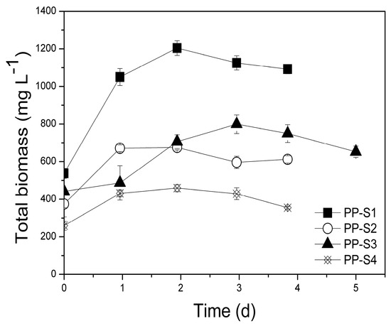 Evolution of total biomass using poultry litter extract (PLE) as substrate in the pilot-scale (P), suspended growth (S) system. PP: Pilot-scale experiment using PLE of different dilutions (S1, S2, S3, S4).