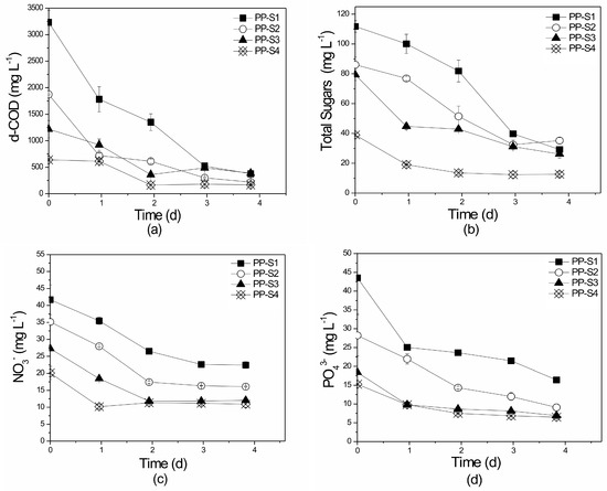 Profile of (a) d-COD, (b) total sugars, (c) NO3−-N, and (d) PO43− removal over time in the different substrates of the pilot-scale (P), suspended growth (S) system. PP: Pilot-scale experiments using PLE of different dilutions (S1, S2, S3, S4). All initial concentrations are given in Table 1.