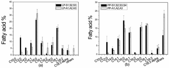 Statistically significant differences of total biomass productivities were observed between LP-A1, A2, and A3 experimental sets (p = 0.016). Significant differences were also detected between LP-S1 and LP-A1 (p = 0.013), while no differences were observed between LP-S2 and LP-A2 (p = 0.181) and LP-S3 and LP-A3 media (p = 0.056).